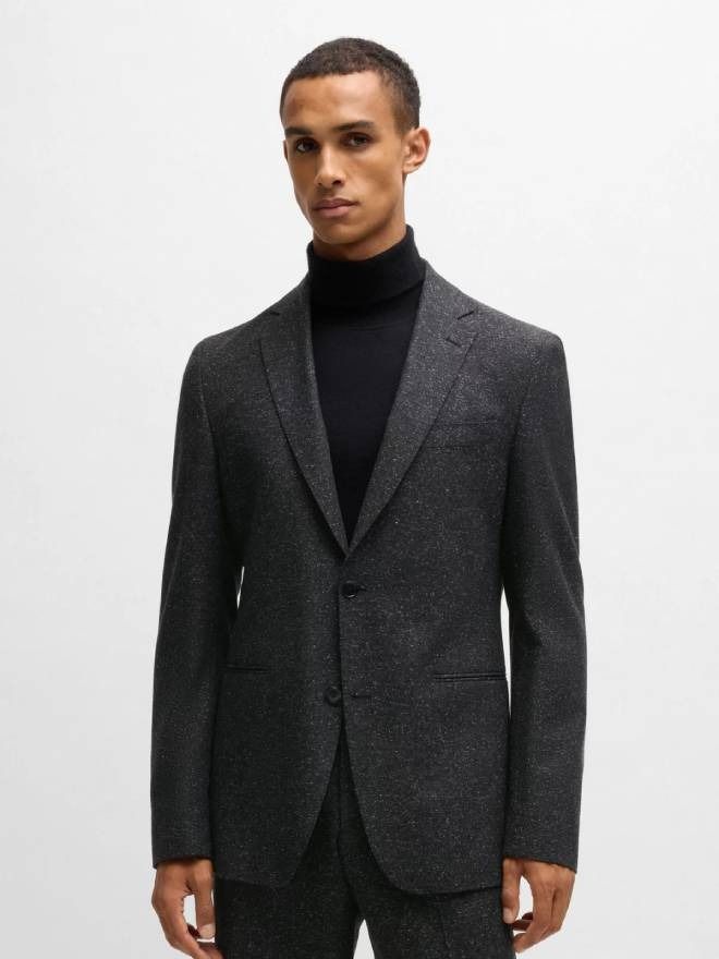 A refined suit by BOSS. Tailored to a streamlined fit and woven with a micro pattern, this two-piece suit is crafted in a virgin-wool blend containing a touch of silk. The jacket features notch lapels and jetted pockets for a sleek look.