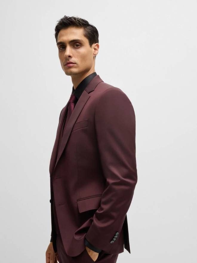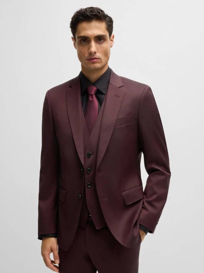 A three-piece suit tailored to a defined fit by BOSS. Blended with stretch for comfort, this elegant ensemble has a subtle melange effect. This product is made with responsibly sourced wool. For us, responsibly sourced means mulesing free, and meeting the standards of the Five Freedoms of animal welfare.